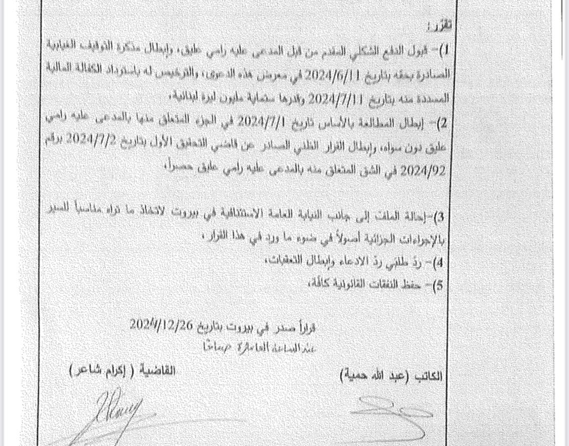 أولاً: قبول الدفع الشكلي المقدّم من المحامي رامي علّيق وإبطال مذكرة التوقيف الغيابية الصادرة بحقّه عن قاضي التحقيق الأول في بيروت بالإنابة بلال حلاوي بتاريخ ١١ حزيران ٢٠٢٤ بسبب عدم مراعاة تبليغه وفق الأصول القانونية وبالتالي إزهاق حقّه الأساسي في الدفاع، مما يُعتبر عيباً إجرائياً أساسياً لا يمكن معه اعتبار المدعى عليه مبلغاً أصولاً ودون أن يكون في الملف أي إثبات لحصول التبليغ!
