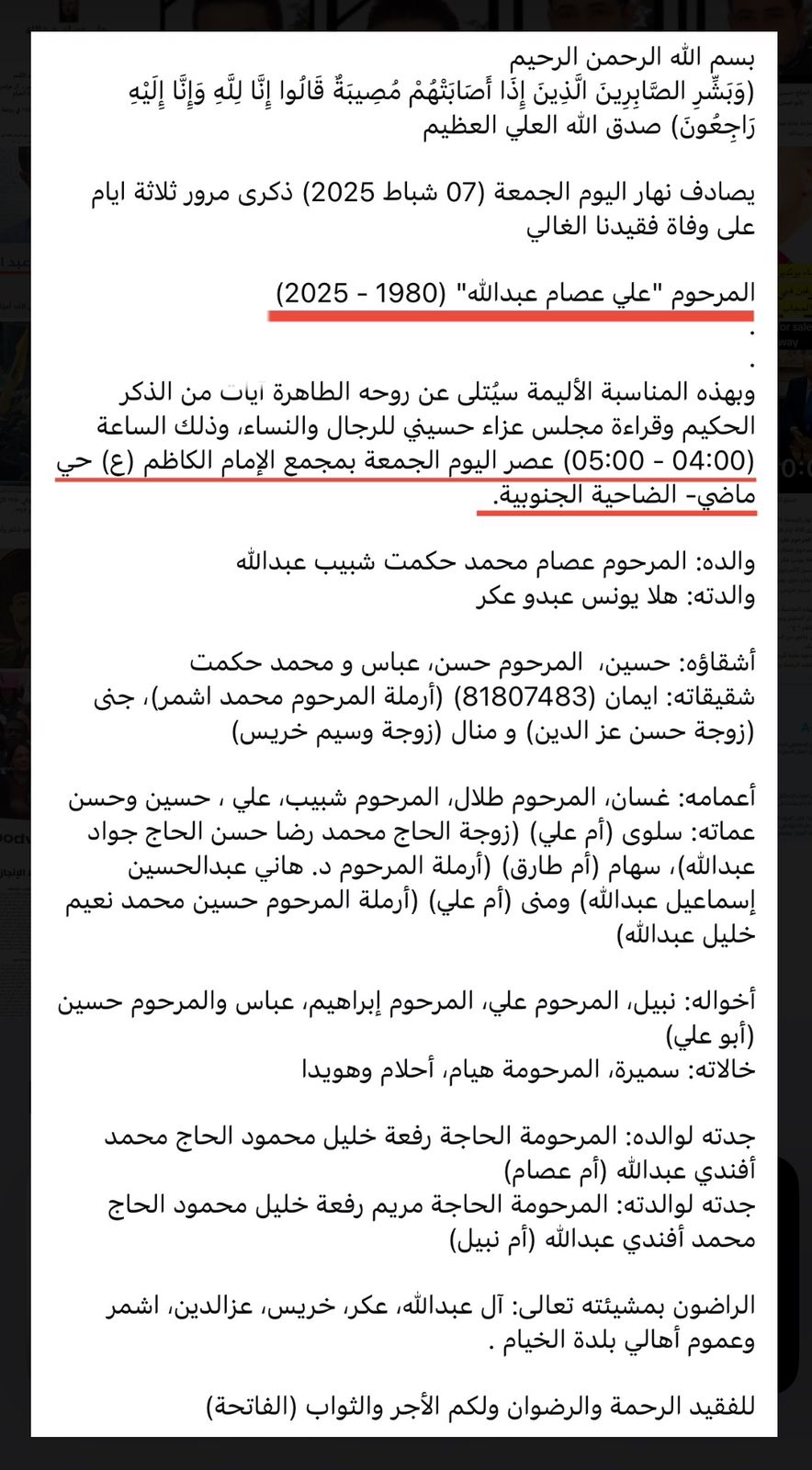 بهذه المناسبة الأليمة سيُتلى عن روحه الطاهرة آيات من الذكر الحكيم وقراءة مجلس عزاء حسيني للرجال والنساء، وذلك الساعة (04:00 - 05:00) عصر اليوم الجمعة 7 شباط 2025 بمجمع الإمام الكاظم (ع) حي ماضي- الضاحية الجنوبية.