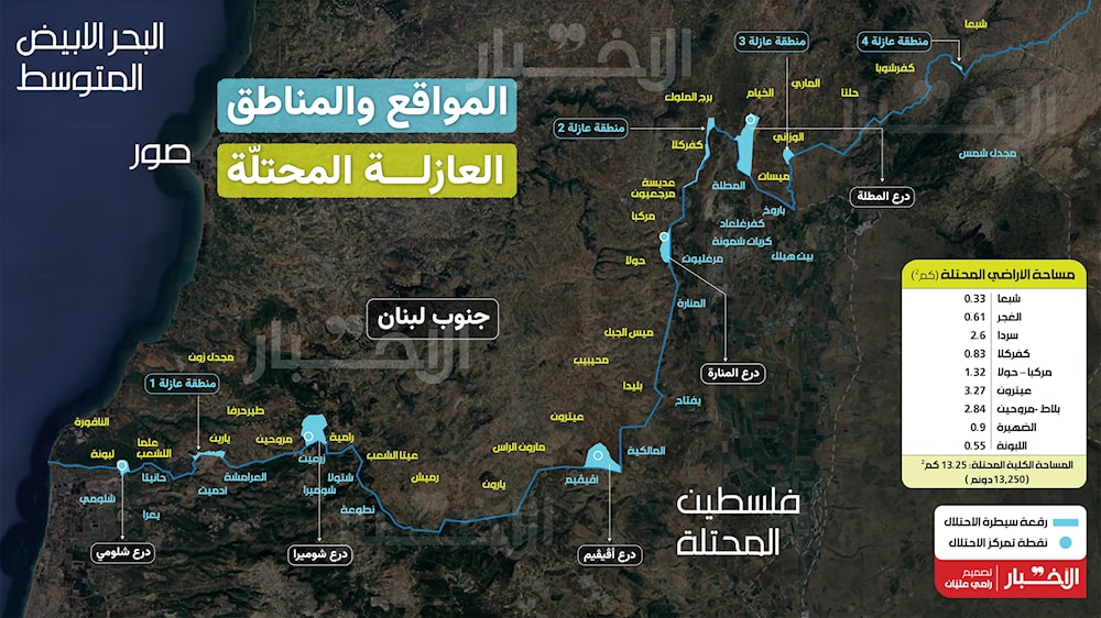 وبذلك، تكون إسرائيل قد أقامت خمسة مواقع عسكرية داخل الأراضي اللبنانية، إضافة إلى أربع مناطق عازلة، وليس اثنتين كما ادّعت في الخرائط التي زوّدت بها القوات الدولية ولجنة الإشراف على اتفاق وقف إطلاق النار. وقد أطلقت تسمية «درع» على مواقعها داخل لبنان، بحيث يكون الموقع درعاً مزعوماً للمستوطنة التي يطلّ عليها، فحملت المواقع تسمية دروع شلومي وشوميرا وأفيفيم والمنارة والمطلّة. وقد بلغت مساحة الأراضي اللبنانية المحتلة نحو 13.25 كيلومتراً مربعاً (13250 دونماً)، وهو ما يمثّل أقل بقليل من 1% من إجمالي مساحة جنوب لبنان.