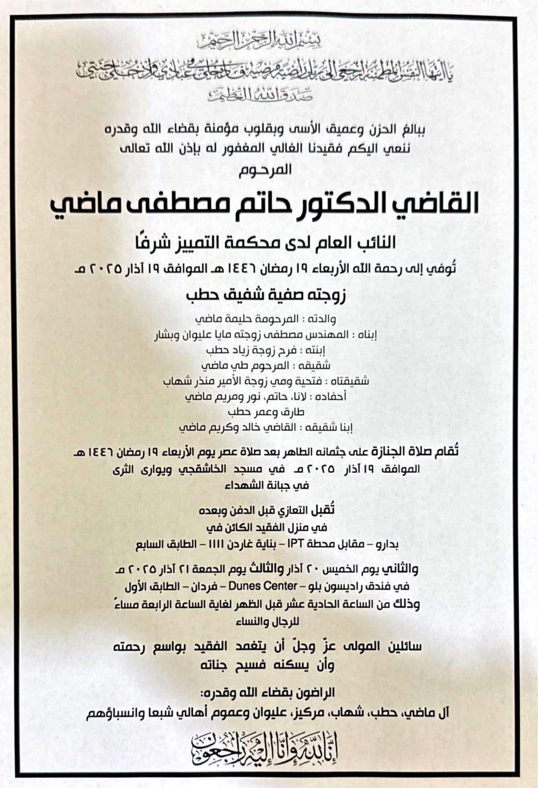 وتقدَّم المؤسسة بالتعازي الحارّة من عائلة الفقيد، ومن قضاة لبنان عموماً وقضاة محكمة التمييز خصوصاً، راجياً لهم الصبر والعزاء.