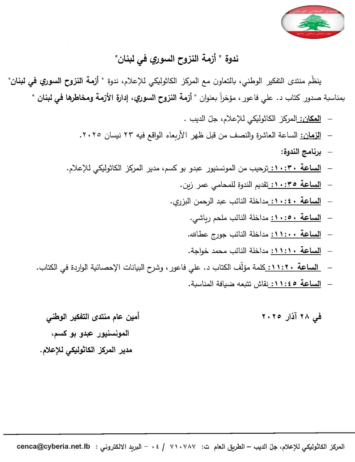 تُعقد الندوة في تمام الساعة العاشرة والنصف من قبل ظهر يوم الأربعاء الواقع في 23 نيسان 2025، في مقر المركز الكاثوليكي للإعلام في جل الديب.