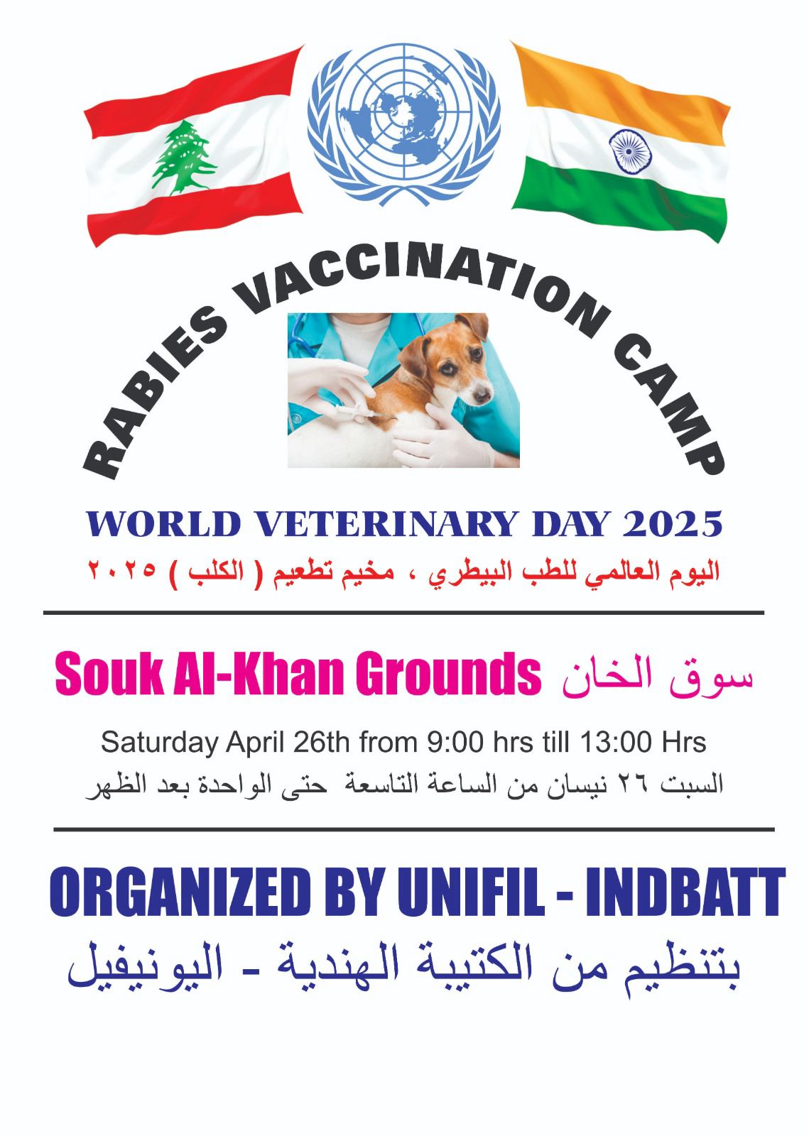 في إطار الاحتفال باليوم العالمي للطب البيطري لعام 2025، تنظم الكتيبة الهندية العاملة في إطار قوة الأمم المتحدة المؤقتة في لبنان (اليونيفيل) مخيّمًا مجانيًا لتطعيم الكلاب ضد داء الكَلَب (Rabies Vaccination Camp)، وذلك يوم السبت الواقع في 26 نيسان 2025 في ساحة سوق الخان، من الساعة التاسعة صباحًا وحتى الواحدة بعد الظهر.