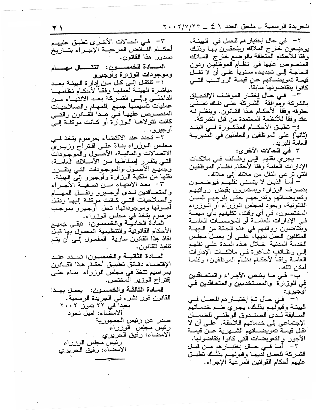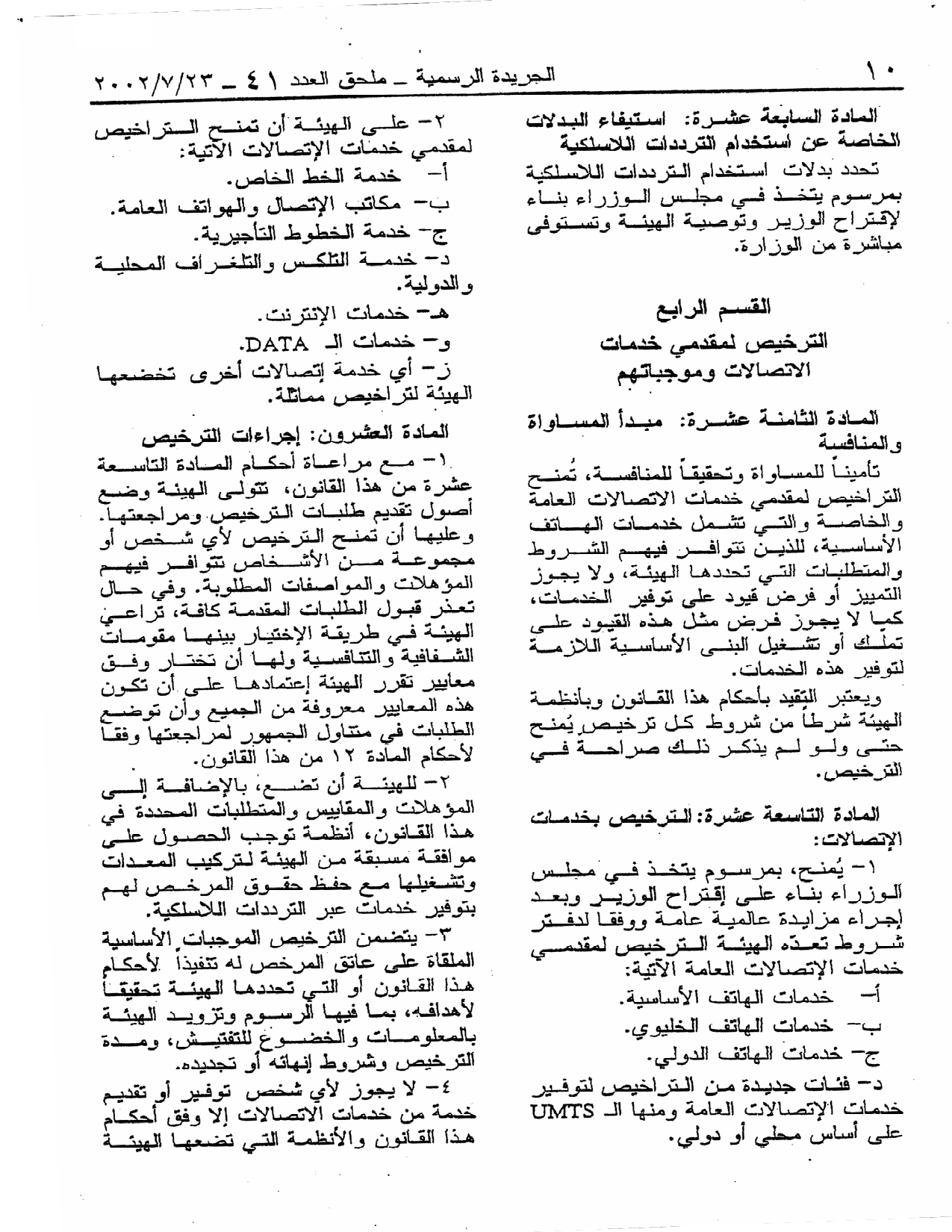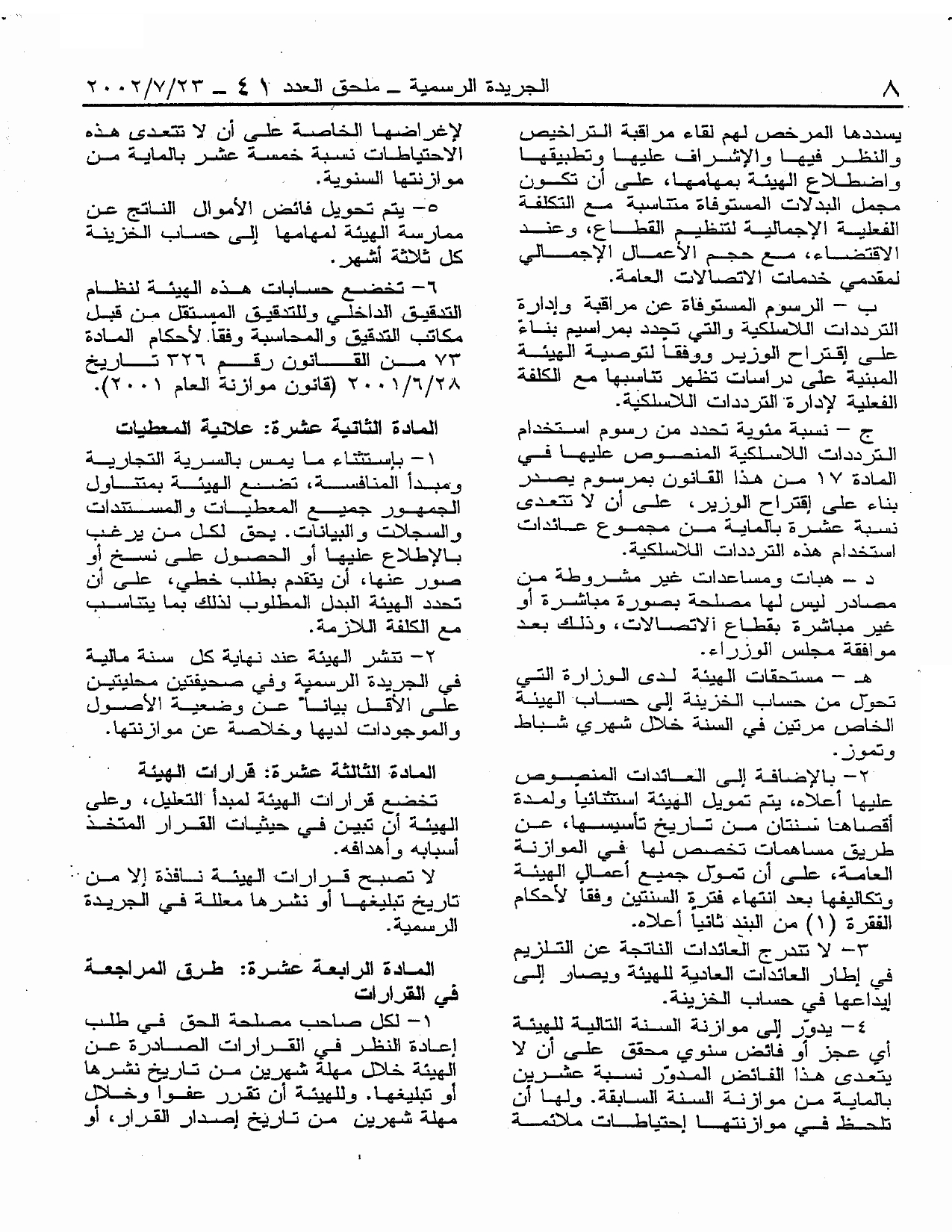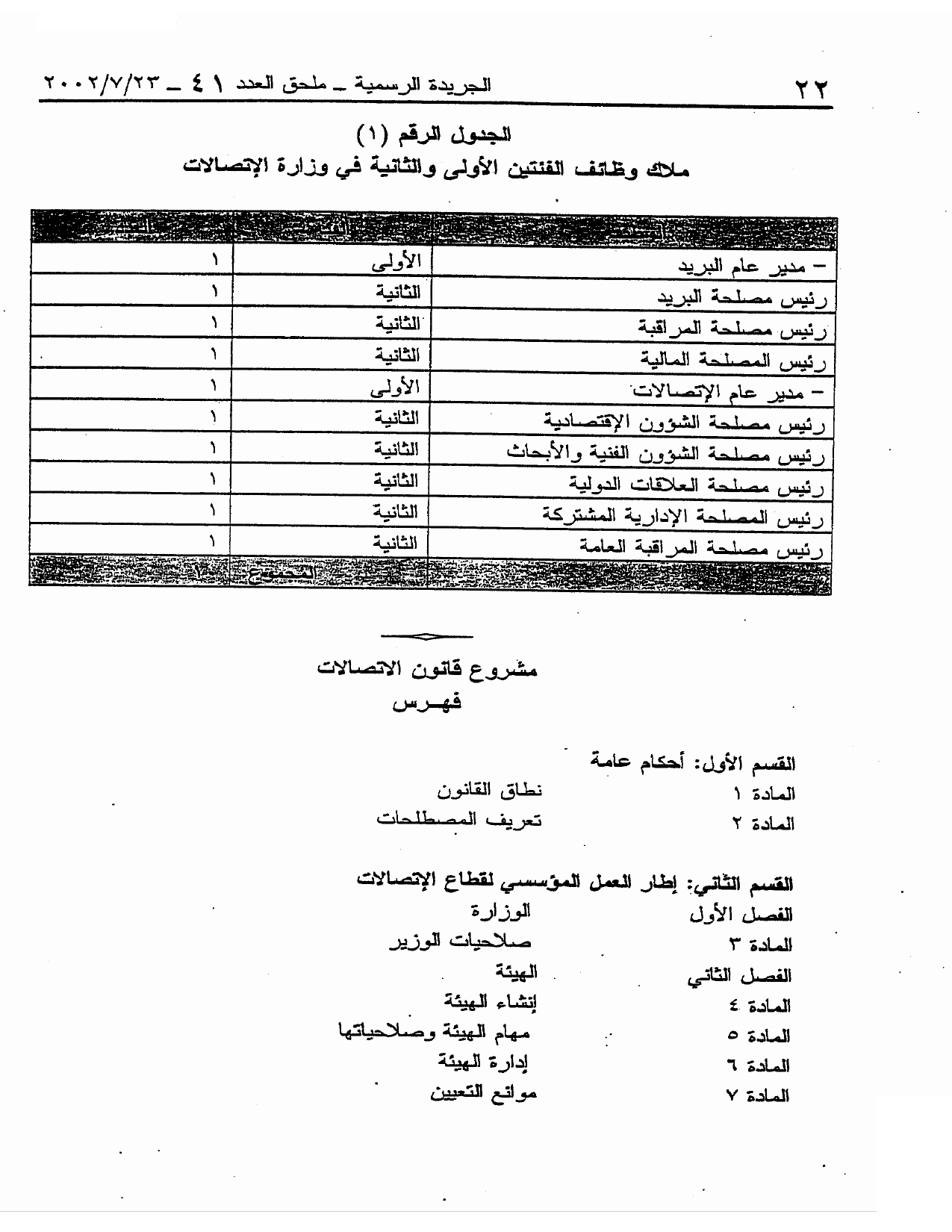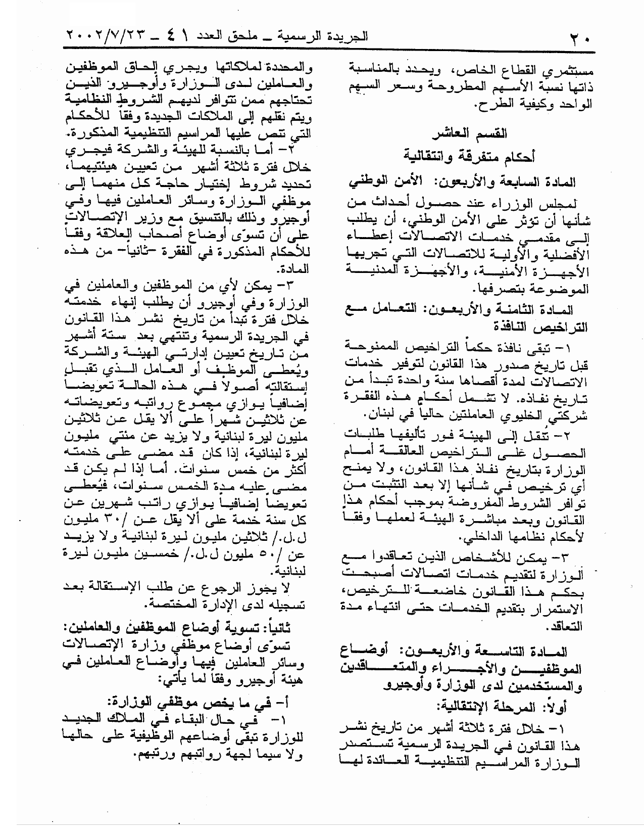 القانون 431 الذي ينصّ على إنشاء الهيئة ، التي انيط بها تحرير وتنظيم وتطوير قطاع الاتصالات في لبنان