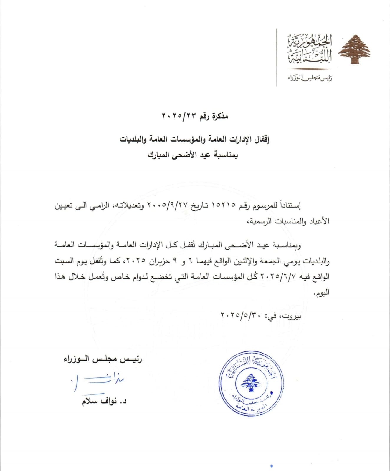 أصدر رئيس مجلس الوزراء، الدكتور نواف سلام، مذكرة رسمية حملت الرقم 23/2025، أعلن فيها إقفال الإدارات العامة والمؤسسات العامة والبلديات بمناسبة عيد الأضحى المبارك.