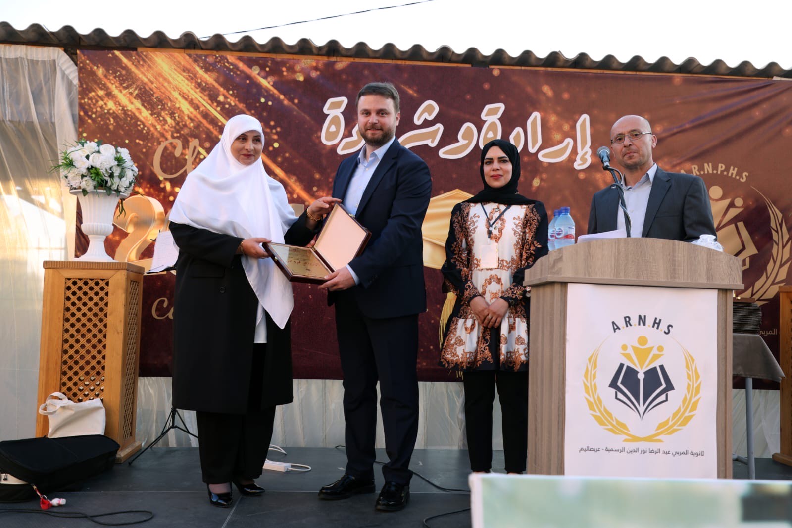بعد ذلك قدمت نور الدبن درعا تقديريا لراعي الاحتفال ، ثم جرى توزيع شهادات تقديرية على الطلاب المكرمين