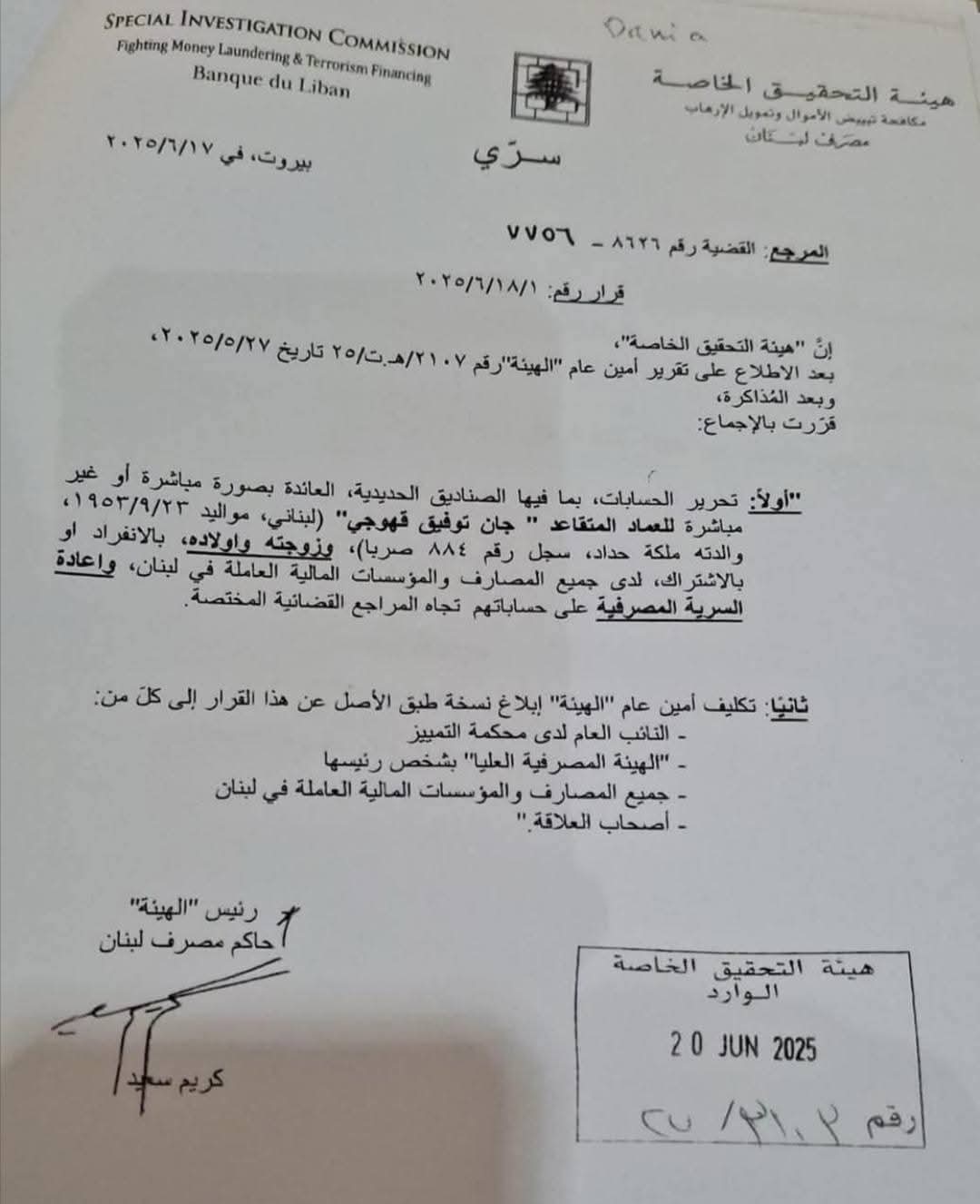 أصدر حاكم مصرف لبنان ورئيس هيئة التحقيق الخاصة، بتاريخ 20 حزيران 2025، قراراً يقضي بتحرير الحسابات المصرفية الخاصة بالعماد المتقاعد جان توفيق قهوجي وورثته، تمهيداً لمتابعة التحقيقات في ملف يشتبه بتورّطه في قضايا مالية.