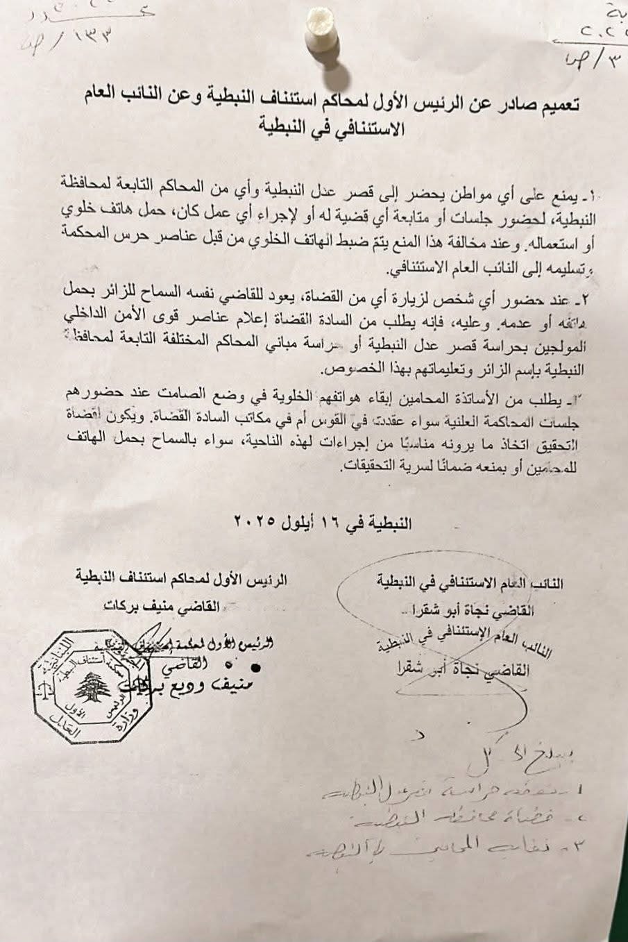 في اليوم الأول لتسلّم القضاة مراكزهم الجديدة، أصدر الرئيس الأول لمحاكم استئناف النبطية منيف بركات قرارًا يقضي بمنع إدخال الهواتف المحمولة إلى قصر عدل النبطية، وذلك بعد إلقاء القبض على شبكة سماسرة تعاونت مع عاملة تنظيف في قصر عدل بعبدا صورت كل التحقيقات والمحاضر من غرف القضاة خلال ترتيب الغرف.