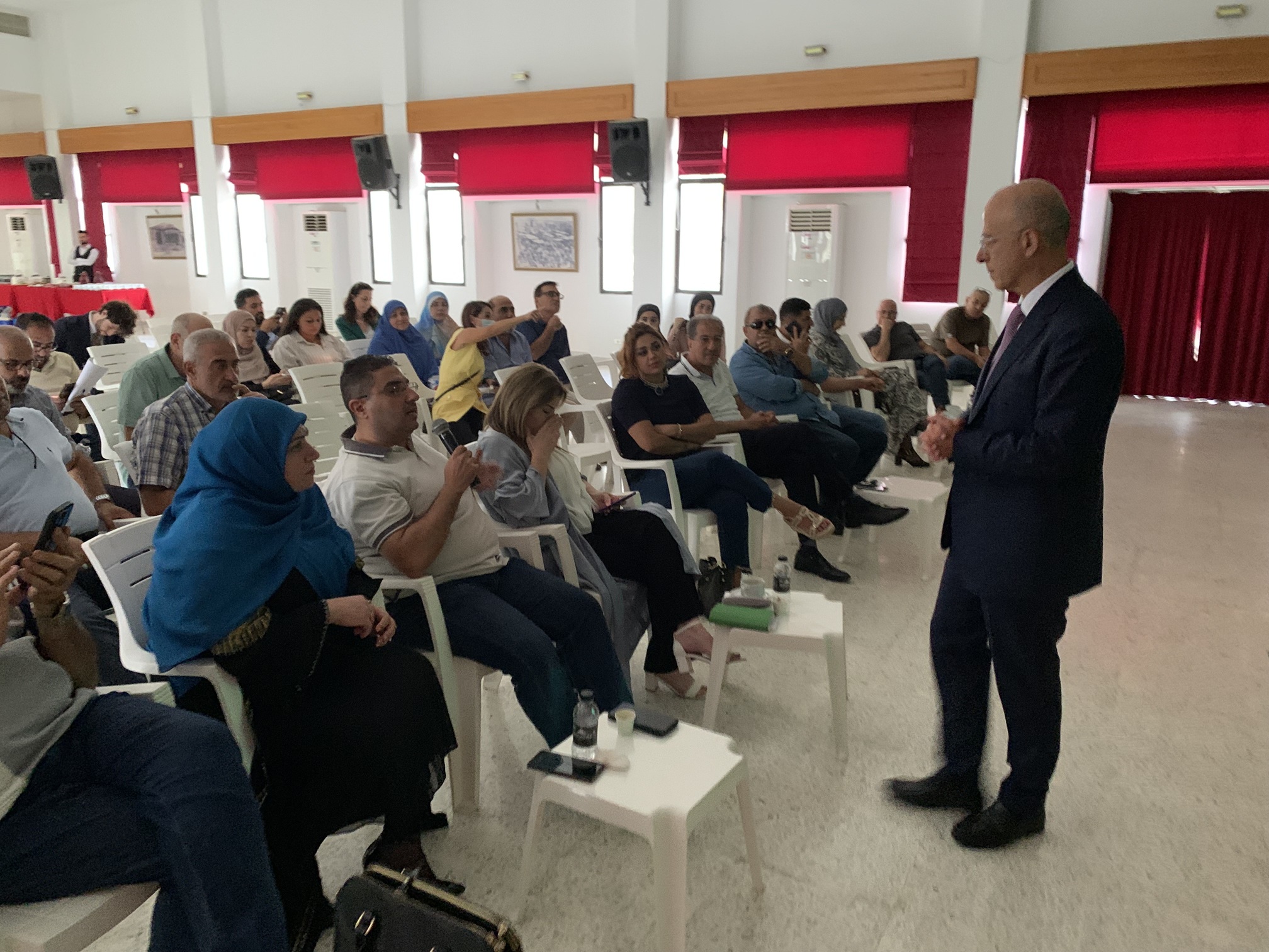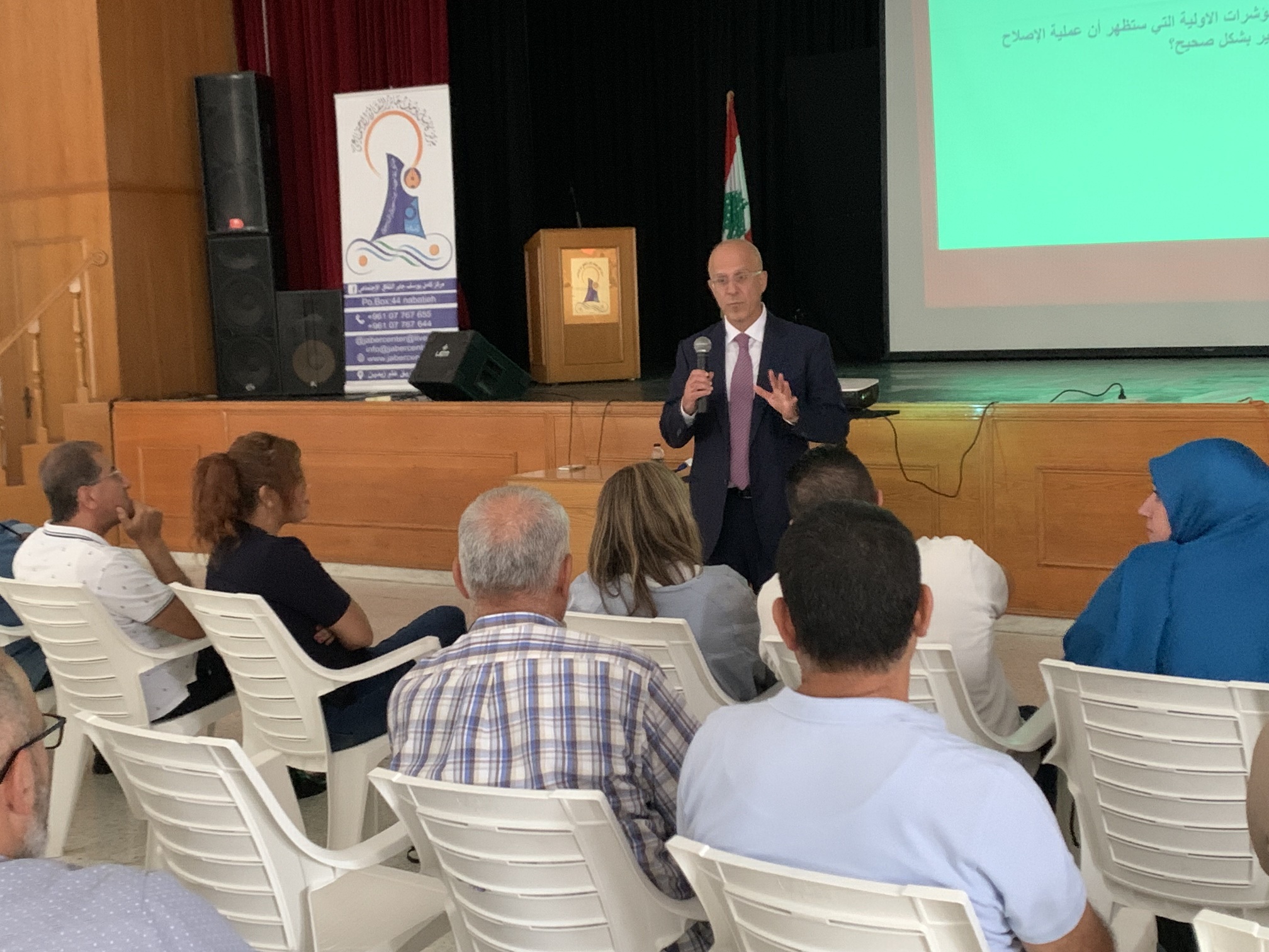 وقد عقد لقائين منفصلين متتاليين ، الأول مع رؤساء الاتحادات البلدية والبلديات، والثاني مع رؤوساء المصالح والادارات الرسمية في مركز كامل يوسف جابر الثقافي في النبطية بحضور وزير الدولة لشؤون التنمية الإدارية الدكتور فادي مكّي وفريق عمل الوزارة بالإضافة إلى محافظ النبطية البروفيسور هويدا الترك، جرى خلالهما الاستماع إلى تطلعات المشاركين ورؤيتهم لدور الإدارات المحلية في إطار اللامركزية، كما تمت مناقشة سبل تعزيز فعالية السلطات المحلية وتمكينها من أداء دورها التنموي والخدماتي.