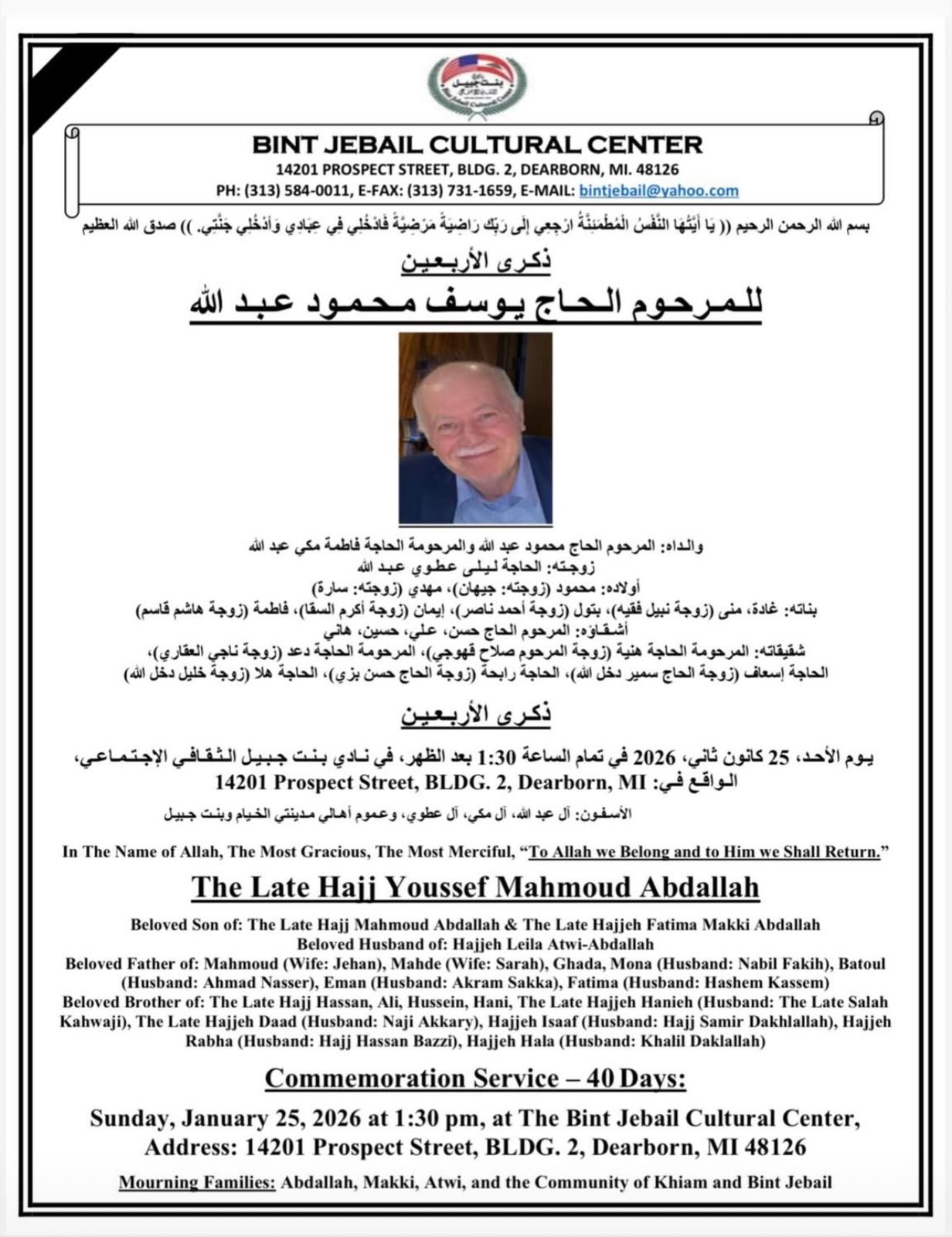 ولهذه المناسبة الأليمة تُقام الذكرى يوم الأحد 25 كانون ثاني 2026، عند الساعة 1:30 بعد الظهر في ديبورن في الولايات المتحدة في نادي بنت جبيل الثقافي الاجتماعي،