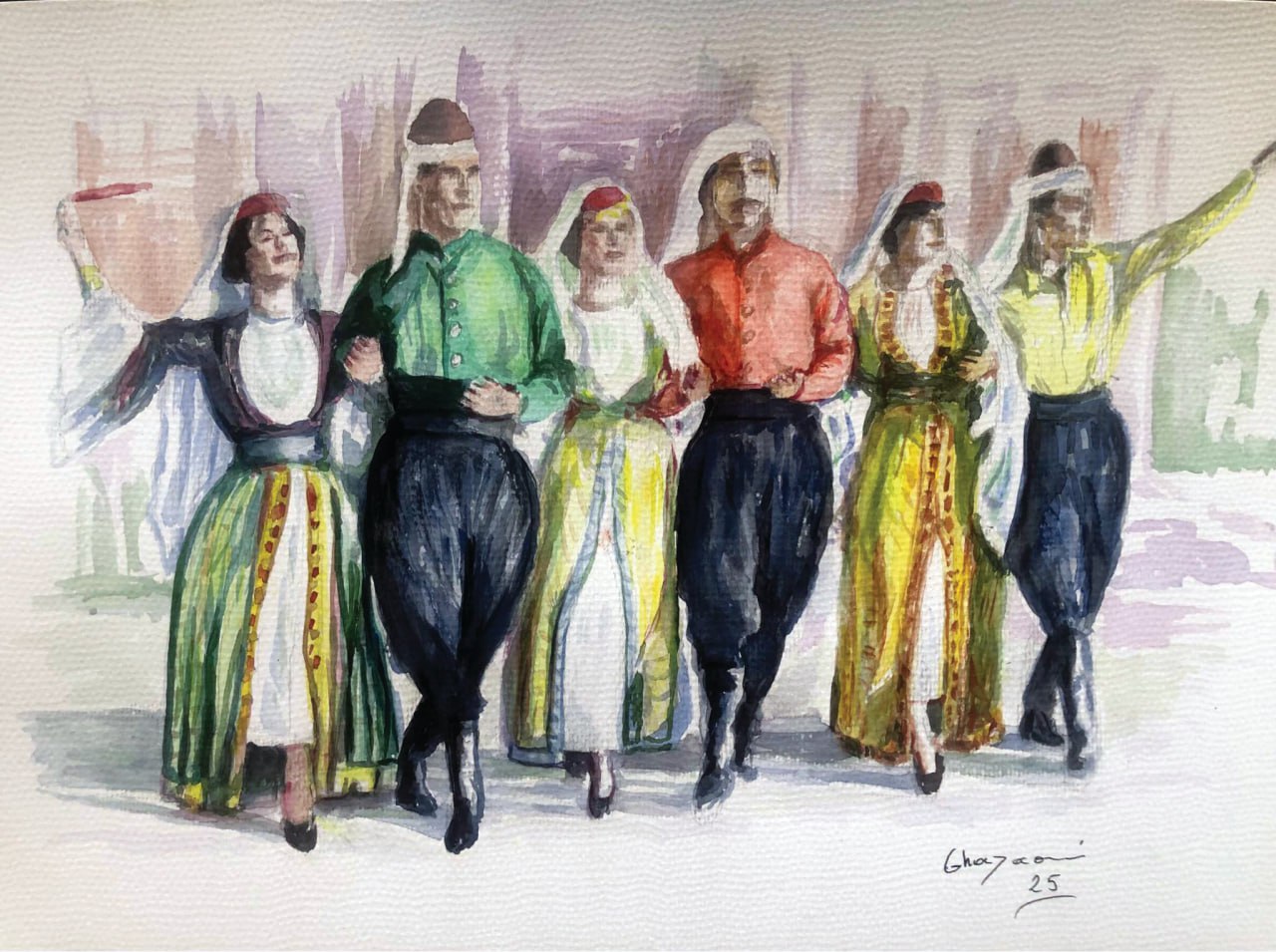 لنذهب الآن في جولة مع الأعمال.. تبدأ في العاصمة بيروت، لنجلس في مقهى من مقاهيها الكثيرة، ونطلب الأركيلة، فيأتي النادل بلباسه الشرقيّ المحبّب وطربوشه الأحمر وشرواله الأسود المتدلّي، يحمل الأركيلة بتنبكها العجميّ الفارسيّ، ومنظرها المزخرف الجميل تسرّ النظر والرئتين. هنا نقف على أدراج مدينة بعلبك الأثريّة الخالدة، وننظر إلى روعة المكان بدهشة وإعجاب. في مكان آخر، نسير على حجارة الطريق الرومانيّ البحريّة، ونرى القنطرة بتفاصيلها وشموخها في أقدم مدن العالم “صور” الجنوبيّة. ثمّ نعرّج على صيدا القريبة منها، لنصطاد السمك في قارب يطفو على سطح بحرها الأزرق الهادئ العذبة أمواجه، وندخل بعدها إلى ممرّات أبنيتها التراثيّة القديمة المحاذية للبحر، ونبتاع بعضًا من الأعمال اليدويّة لبعض الحرفيّين. نتابع جولتنا على الأعمال، فنجلس بجانب صاج الخبز، نستنشق رائحة المرقوق الشهيّة العذبة. نسنظلّ تحت شجر الأرز المعمّر لنملأ رئتينا هواءً نقيًّا، صافيًا، منعشًا وسماويًّا. نشارك إيقاع الدبكة بعد أن تتعانق الأيدي فرحًا ورقصًا وأنغامًا شرقيّة. نتمايل مع الراقصة الشرقيّة بلباسها المزخرف اللامع المشعّ الذي يخفي القليل من مفاتن الجسد الساحر المتمايل من الرأس حتى أخمص القدمين. نلتقط إبريق الفخّار لنرويَ عطشًا بماء بارد لذيذ. ننتظر “الفراكة والكبّة” من جرن الكبّة الذي تتأوّه قطعة اللحم داخله من ضربات نسوة القرية الخبيرات، بعد أن يُضاف إليها البرغل وحوائجه. ننتقل إلى ساحة بلدة الخيام الجنوبيّة لنسلّم على القرويّين المعمّرين الجالسين صفّا واحدًا على مقعد طويل من الباطون بالكوفيّة والعقال. ننتظر حاملات الحليب الطازج لنرتشف الأبيض الطازج المنعش الموضوع في أوانٍ فخاريّة. نراقب نَسر جبل حرمون “جبل الشيخ” بكبريائه وألقه ونظراته الحادّة المتعالية ومنقاره الصلب. نتابع رحلتنا في ربوع هذا الوطن لنصعد إلى شوفه وجبله وسهله وقراه.. هنا يوجد باب قديم يُعلن عن منزل قديم هجره أصحابه، وهناك منازل أثريّة أخرى بقرميدها الأحمر وقناطرها وحجارتها الصخريّة المنحوتة بيد بنّائيها المهرة، ونوافذ بقالب شرقيّ زيّنت المنزل، وزاده جمالًا على جمال، تُريح النظر والنفس والسكنَ. تمرّ بجانبنا دجاجة مع صيصانها بجوقتهم ولهوهم المحبّب. يظهر شجر السنديان والبلّوط والعريشة أمام المنازل، والنسوة المحجّبات بزيّهنّ القرويّ، على سطح بين ترابيّ قديم، يُحضّرنَ المونة لادّخارها في المنازل. نجلس على كرسيّ قديم مصنوع من القشّ بيد حرفيّ ماهر.. نتابع رحلتنا لنكحّل عيوننا بجميلات لبنان يرتدين الأزياء الفلكلوريّة، ممّا زاد المشهد جمالًا على جمال. وهنا تطالعنا لوحة تحمل عنوان “مجد لبنان” حيث أيقونتا الغناء والطرب اللبنانيّ، الوجهان المحبّبان والمفضّلان لدى اللبنانيّين، ونعني بذلك السيّدة “فيروز”، والكبير “نصري شمس الدين” اللذان أطلّا عبر وجهيهما فقط، وقد وضع نصري طربوشًا أحمر وشاربين عُرف بهما في حفلاته ومسرحيّاته المختلفة. أمّا فيروز فقد أطلّت علينا بمنديلها الأحمر الذي يُغطّي نصف الرأس ولباسًا فولكلوريًّا مزخرفًا يُحاكي عادات وتقاليد هذا الوطن التي يحنّ إليها اللبنانيّ. وجهان مواجهان لنا ببراءتهما وحبّهما ونظراتهما التي تخترق القلب، والموزّعة بين المباشر والبعيد.. وهناك أيضًا وجه “الصبّوحة”، الباسم كعادته، وقد ارتدت، بدورها، زيًّا فولكلوريّا ملوكياً. وهناك أيضًا أعمال تُظهر نساء لبنان الجميلات بأزياءهنّ الفولوكلوريّة المنوّعة والمُلفتة..