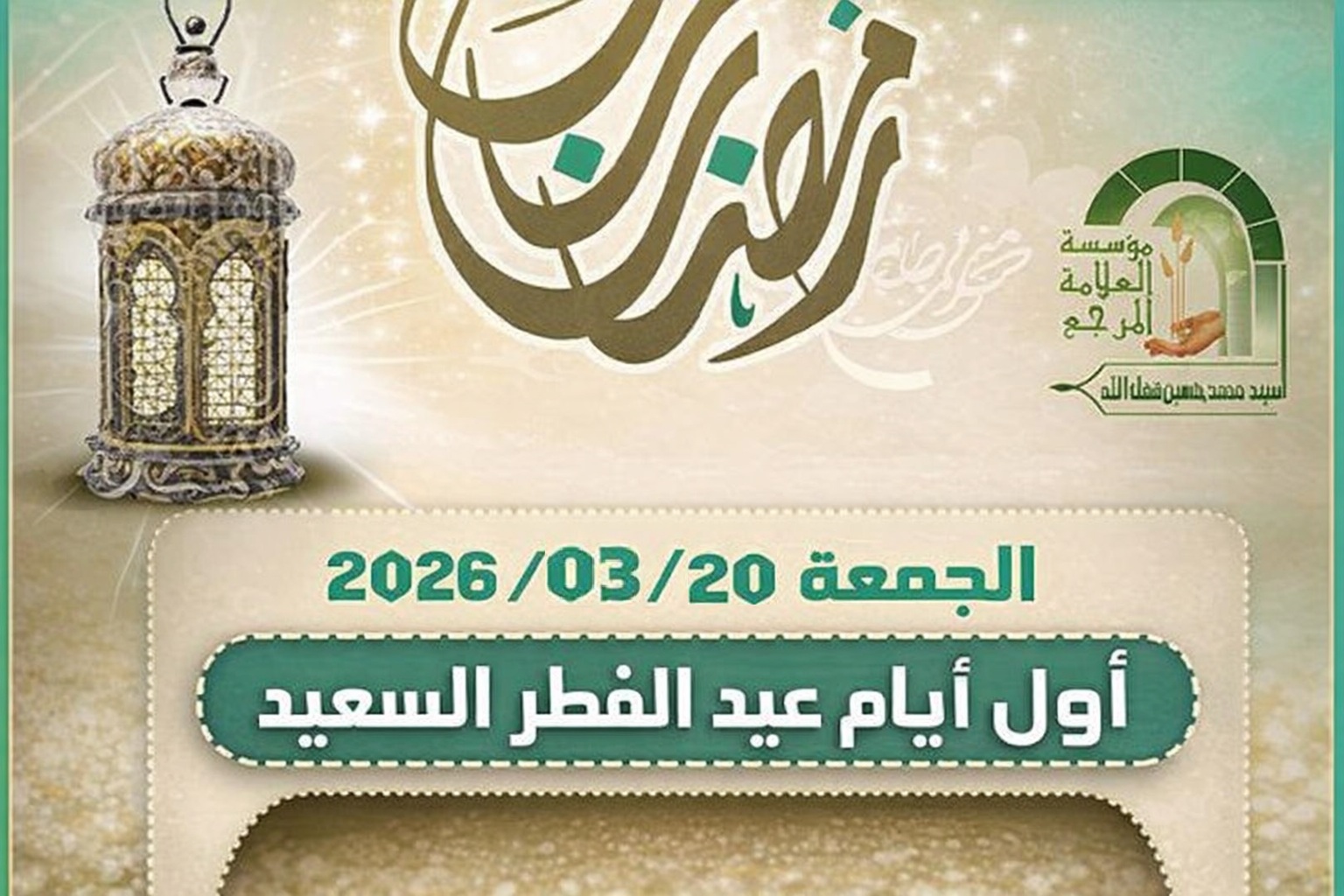 أصدر المكتب الشّرعي في مؤسّسة العلامة السيّد محمد حسين فضل الله، بيانا أعلن فيه أنّ "يوم الجمعة الواقع فيه 20 آذار 2026 هو أول أيام عيد الفطر، آخذاً بالحسابات الفلكية الدقيقة مع إمكانية الرؤية.