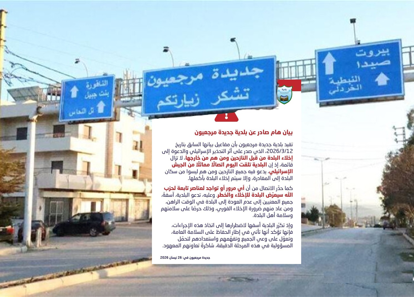 أصدرت بلدية جديدة مرجعيون بيانًا دعت فيه إلى الإخلاء الفوري للنازحين، ومن هم من خارجها، مؤكدة أن مفاعيل بيانها السابق الصادر بتاريخ 12 آذار 2026 لا تزال سارية.