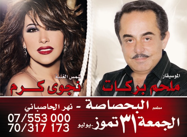 لا شك أن ليلة رائعة ستشهدها المنطقة مساء الجمعة المقبل، في آخر أيام هذا الشهر، باللقاء الذي طالما انتظرناه في الحفل الفني الكبير الذي سيحيه الموسيقار ملحم بركات إلى جانب المطربة نجوى كرم على ضفاف الحاصباني...