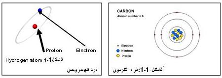 إن جميع المواد الموجودة في رحاب هذا الكون تتألف من عناصر متواجدة، إما في حالة غازية أو سائلة أو صلبة. يوجد في الطبيعة مئة عنصر منها الحديد والنيكل والألمنيوم والكلس والذهب والفضة واليورانيوم وغيرها من العناصر. ولو أخذنا مكعّباً صغيراً من الذهب وبدانا نُقسِّمه إلى قطع أصغر ثم أصغر نصل في النهاية إلى جزءٍ نهائي لا يمكن تجزئته ويملك جميع خصائص وميزات الذهب. هذا الجُسيم الصغير نسمِّيه الذرة. ولو أردنا أن نقارن حجم الذرة بحجم تفاحة، مثلاً، فكأننا نقارن حجم التفاحة بحجم الكرة الأرضية. غير أن هذه الذرة لها سحرها وجمالها، فهي تعطي الضوء وتدخل في تركيبة وجود هذا الكون كما لها فعلها في نشوئنا المادي والعضوي. نقدم في الشكل-1-1 رسماً كمـَثلٍ لتركيبة ذرة الكربون وذرة الهيدروجين: نرى أن نواة ذرة الهيدروجين تتألف من بروتون واحد وألكترون واحد.