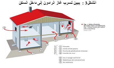 ويستطيع أن يتسرب بين الصخور ذات التفسخ ومن خلال التربة. هذا الغاز يمكن أن يدخل البيوت السكنية وأن يكون خارجها( راجع الشكل-3)، كما أنه يتواجد في مواد البناء كالغرانيت، والرمل والسيمنت، والجفصين والفوسفات. ففي حال تنشق غاز الرادون لمدة طويلة يمكن أن يسبب داء السرطان في الرئة، كما حدث ويحدث لعمال مناجم اليورانيوم.