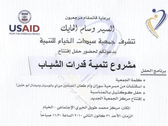 حفل افتتاح مشروع تنمية قدرات الشباب مريم الشيخ علي 28\1\2010 موقع خيامكم Google+TwitterFacebookWhatsApp . برعاية معالي قائمقام مرجعيون، السيد وسام حايك، تقيم جمعية سيدات الخيام حفل افتتاح مشروع تنمية قدرات الشباب. المكان: مركز محمد طويل الخيري الإجتماعي - الخيام الزمان: الأحد 31 كانون الثاني 2010 الساعة 11:30 صباحاً
