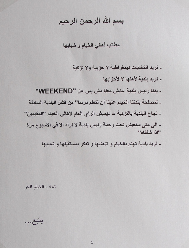 كما في كل إنتخابات بلدية، يسارع البعض إلى إطلاق حملاتهم الإعلامية بطريقة أو بأخرى.. في هذا الإطار تتواصل في الخيام وتيرة إطلاق السهام على البلدية متخذة شكلاً جديداً هذه المرّة عبر طباعة منشور (لا يحمل تواقيع أفراد أو جهات معينة أو معروفة)، جرى توزيعه سراً ليل أمس في شوارع البلدة..